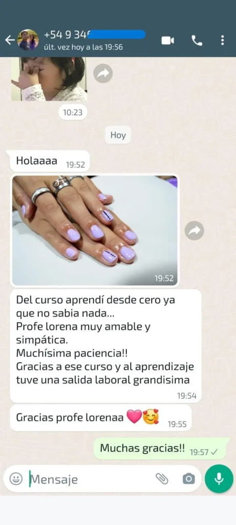 CAMILA GARCÍAMuchas gracias a la profe Lorena, por mostrarnos todo su conocimiento y trayectoria la verdad para mi es un placer aprender de tan calidad de persona termine el curso hace ya un mes y he logrado perfeccionar las técnicas que realizo y aumentar mi clientela ya que las chicas quedan fascinadas y me recomiendan mucho